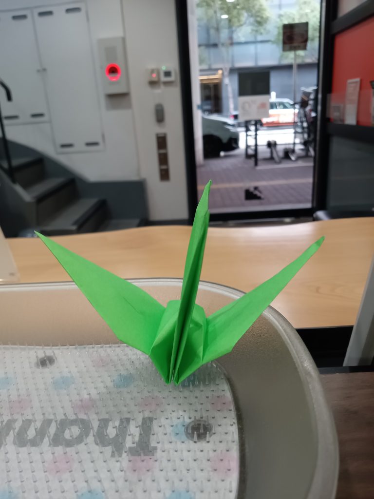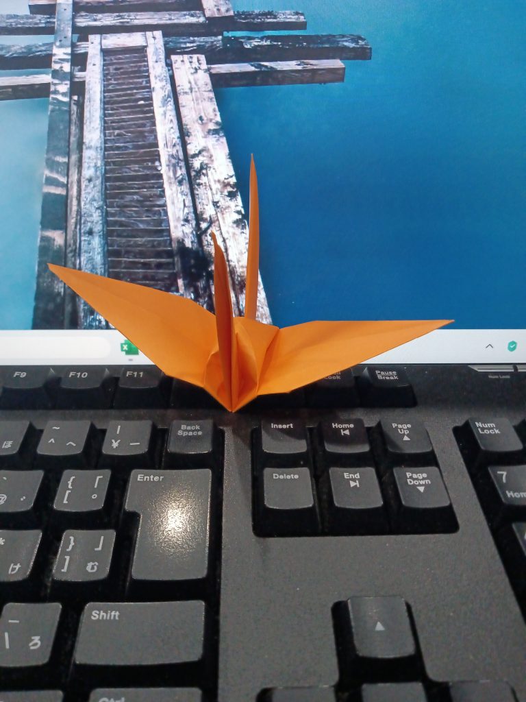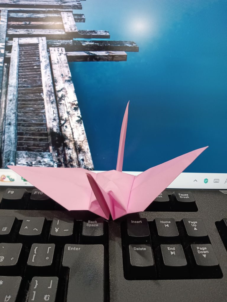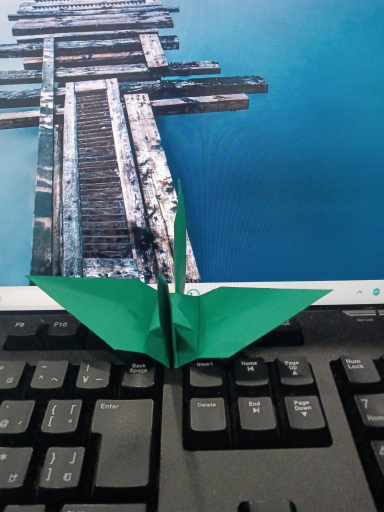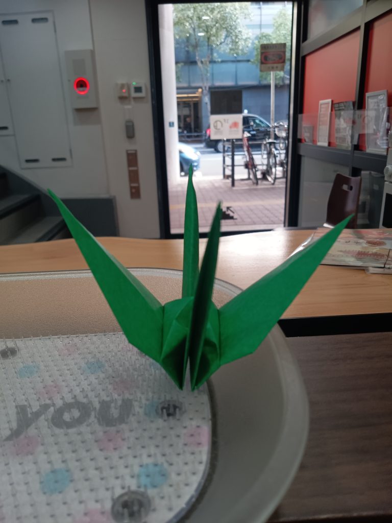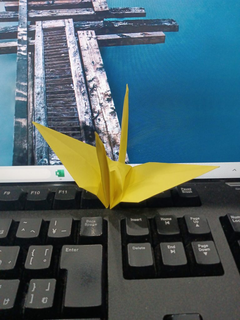 折り鶴、第1号。我ながらきれいに折れた。あと999羽、作成すればゴールである。最低でも、1日1羽のペースを守りたい。調子が乗ってきたら、1日に複数羽、折ってみよう。