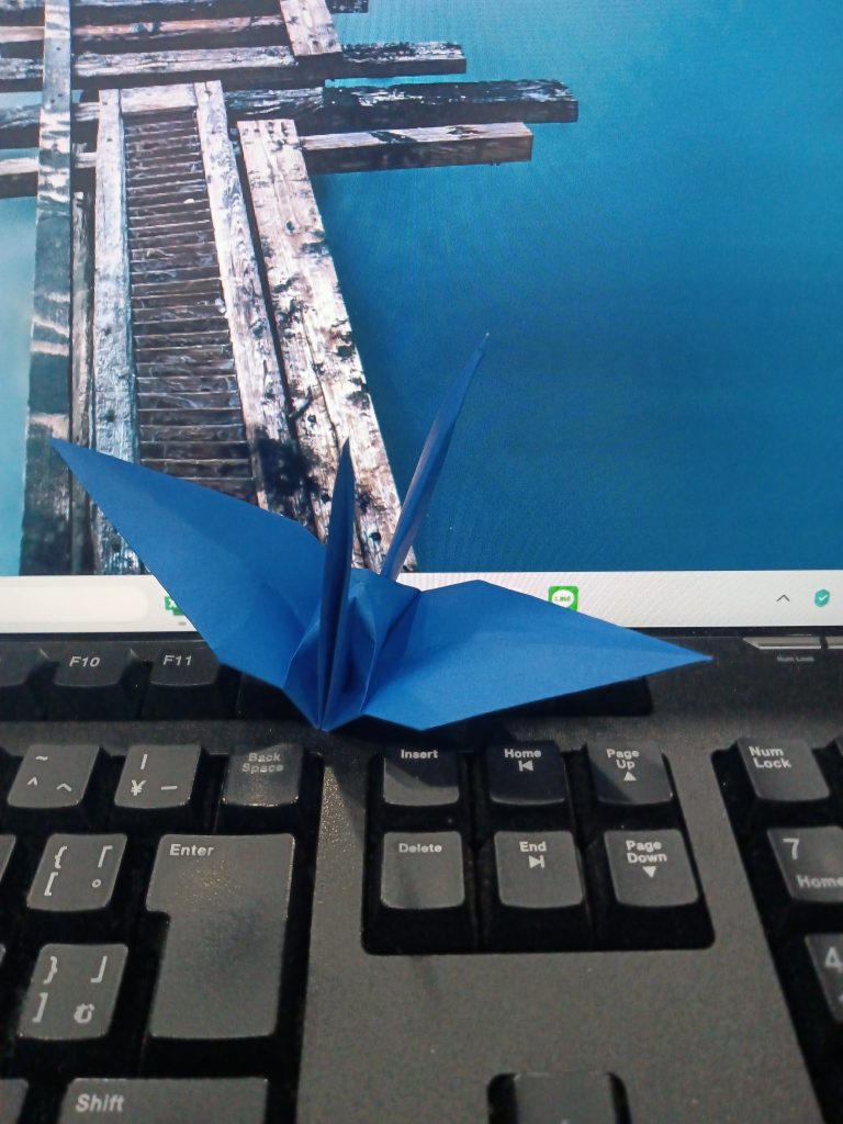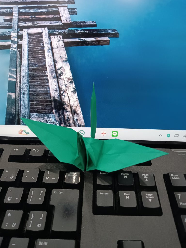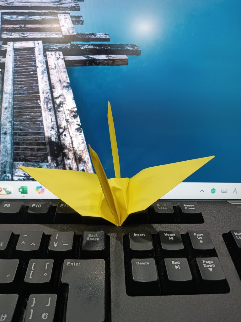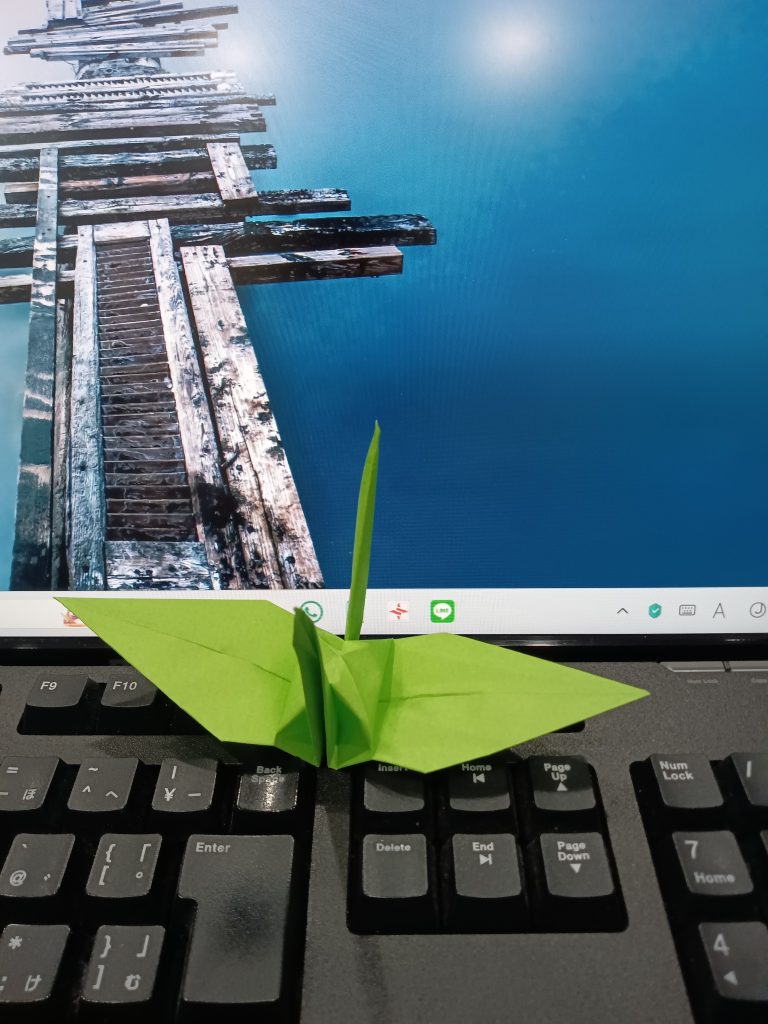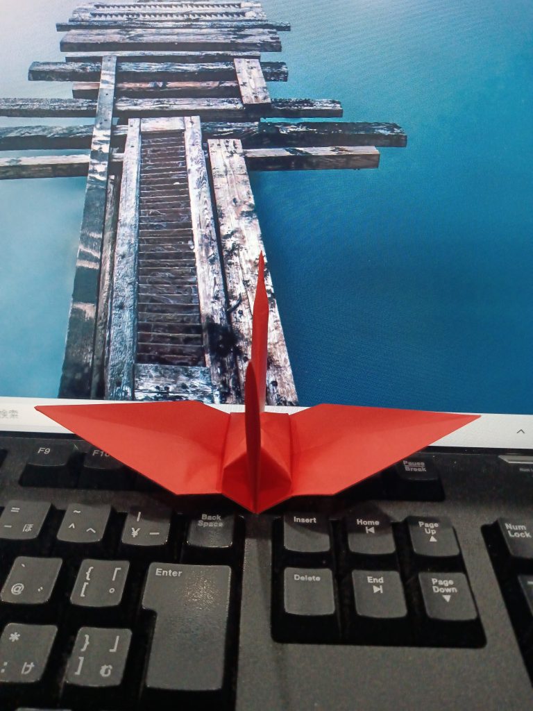 折り鶴、第1号。我ながらきれいに折れた。あと999羽、作成すればゴールである。最低でも、1日1羽のペースを守りたい。調子が乗ってきたら、1日に複数羽、折ってみよう。