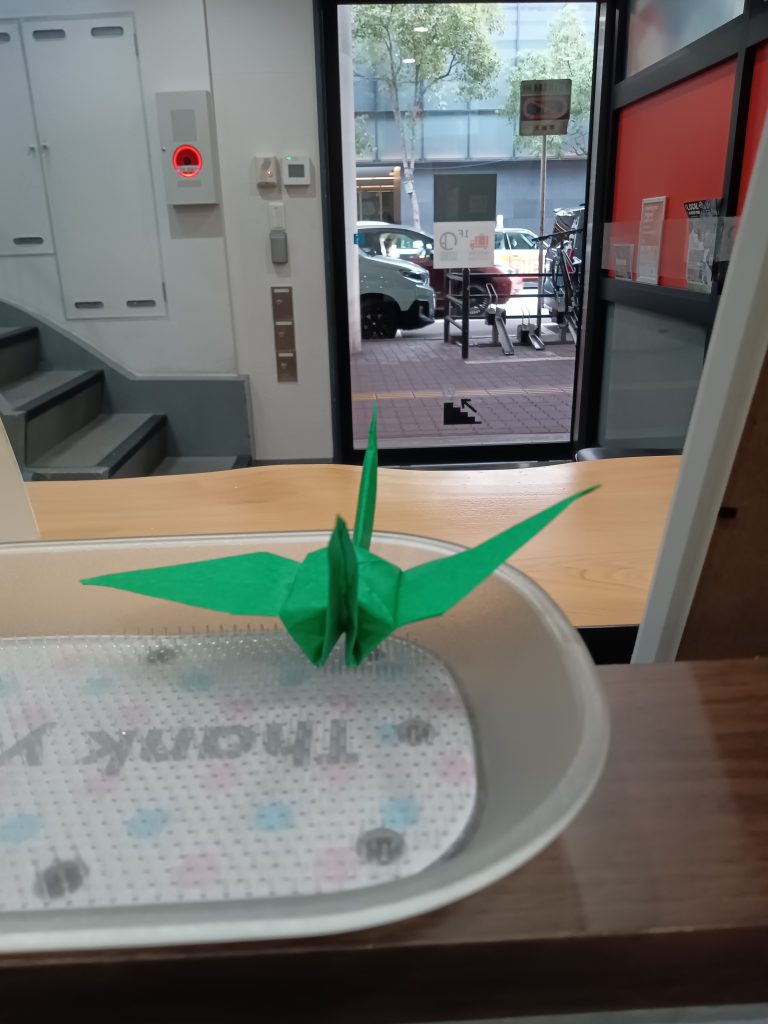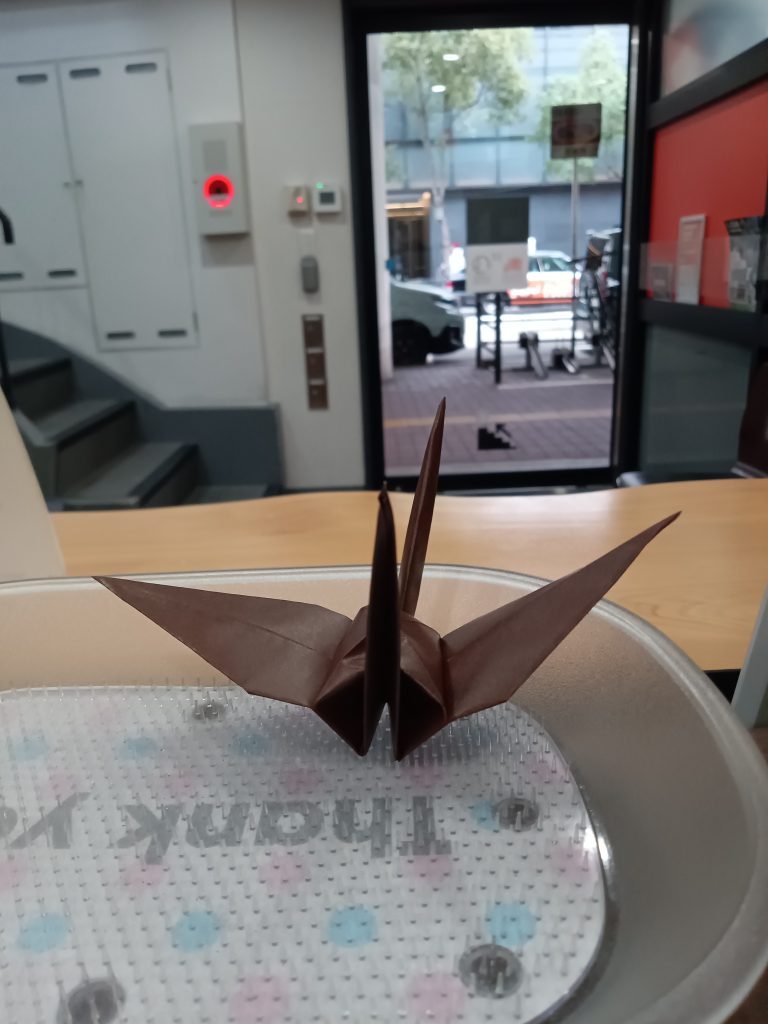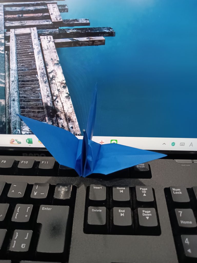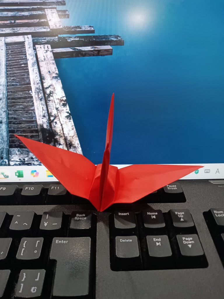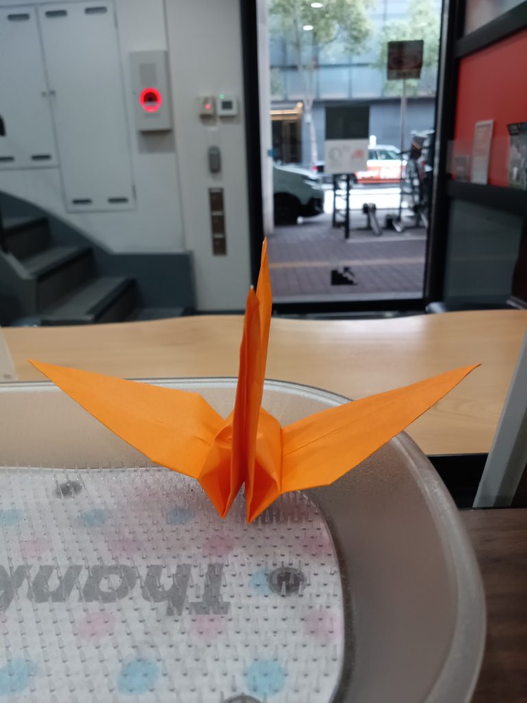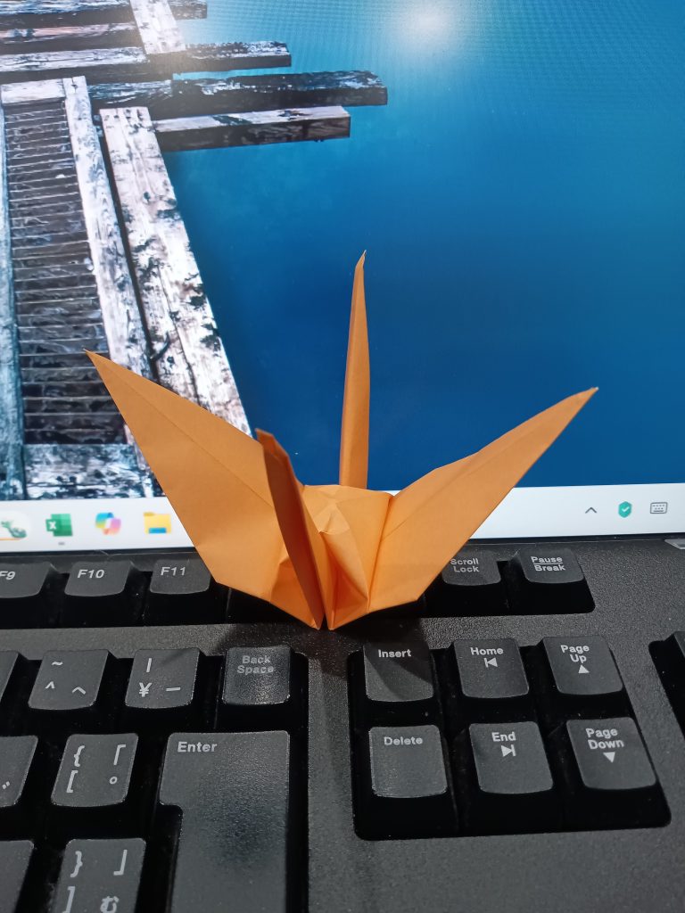 折り鶴、第1号。我ながらきれいに折れた。あと999羽、作成すればゴールである。最低でも、1日1羽のペースを守りたい。調子が乗ってきたら、1日に複数羽、折ってみよう。