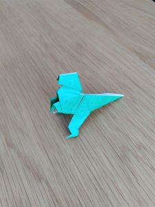 多分、ティラノサウルス、だと思う。ただ、本物と同じようなバランスにしたい場合は、頭をもう少し大きくする方がいいかもしれない。でも、折り紙としては、こっちのバランスの方がかっこいいよねっ。大人の事情ということで、よろしくご理解いただきたい(何を?)