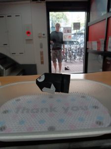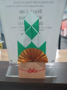 別のスタッフから、きれいに折れていると言われ、気を良くしてもう一つ、手裏剣を折ってしまった。2つめは、ちょっと端をきっちり揃えることができなかった。地味に悔しい…。