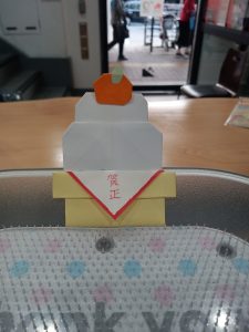 ということで飾り物、鏡餅でした。絵に描いた餅、ではなく、折り紙で折った餅、でした。