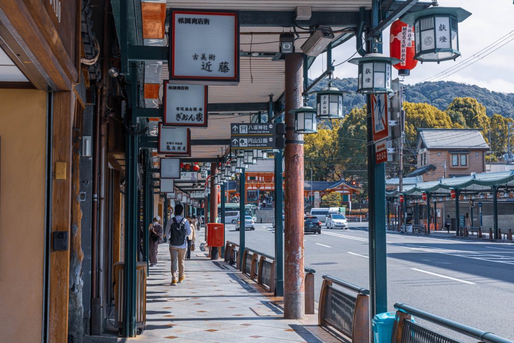 祇園の街並み(徒歩5分):花見小路など、京都らしい風情が残る花街。