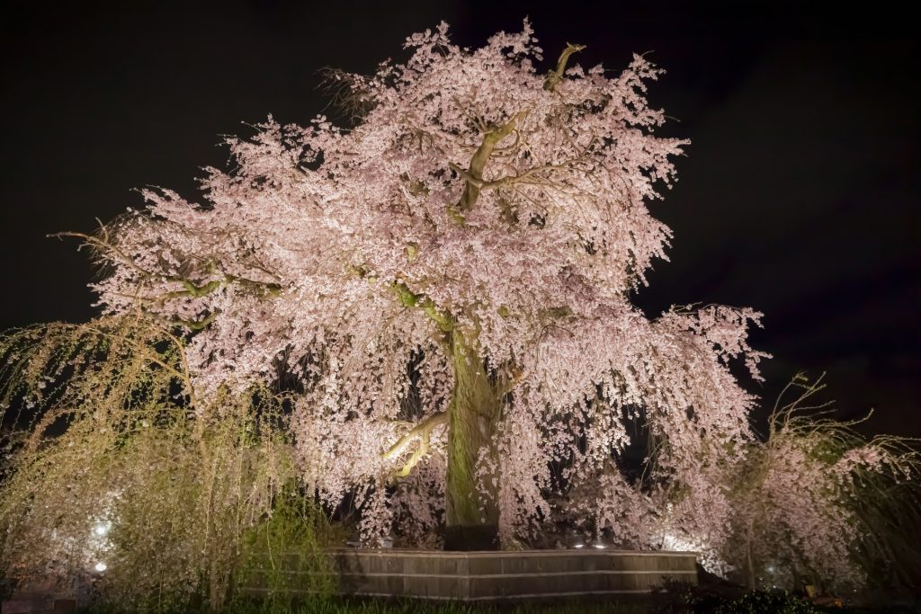 桜のシーズン中、日没から夜間にかけて幻想的にライトアップされます。かがり火に照らされた夜桜の姿は、京都の春を象徴する絶景として、多くの人々を魅了します。