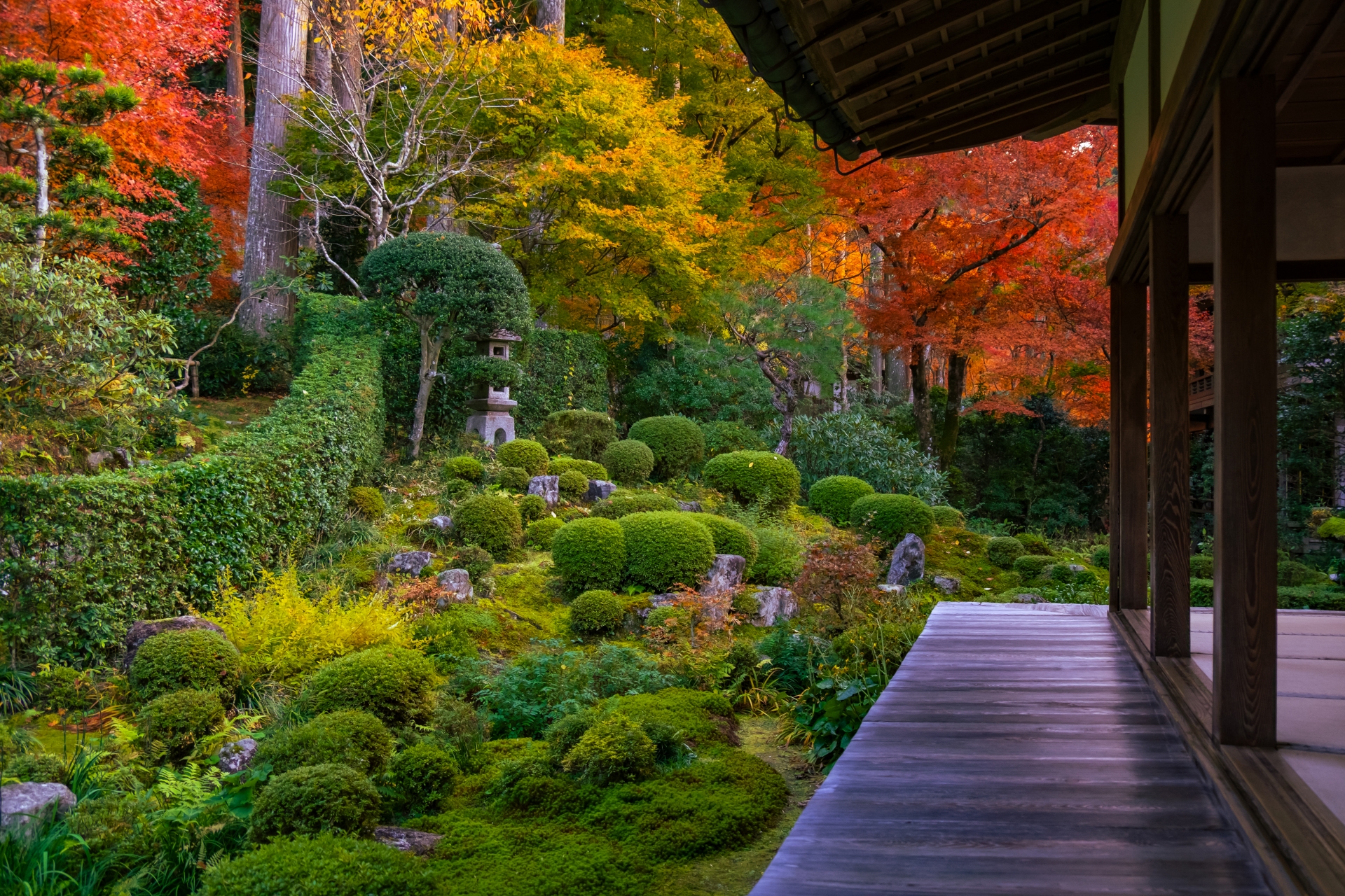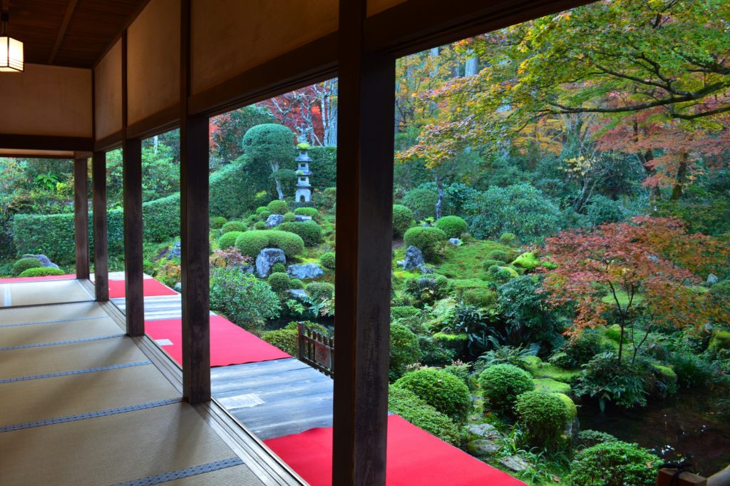宝泉院(徒歩3分):「額縁庭園」と「血天井」で有名。客殿から眺める庭園が額縁のように見えます。