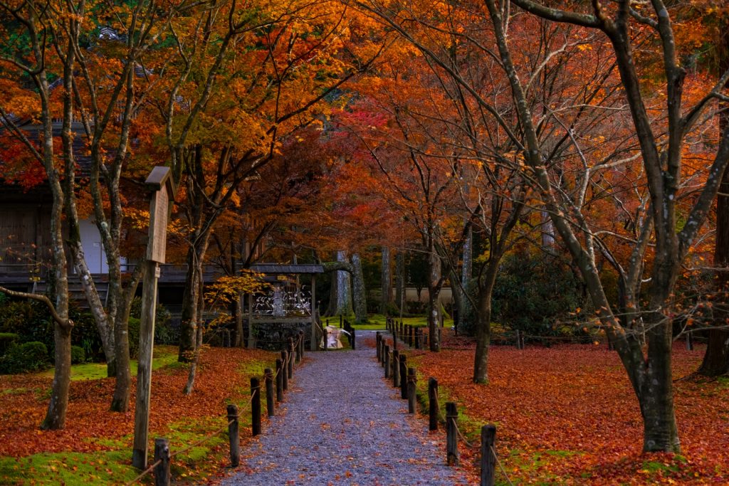 三千院は「日本紅葉の名所100選」に選ばれた大原エリアの中心的存在です。例年11月中旬〜下旬が見頃で、緑の苔のじゅうたんの上に散る紅い葉のコントラストは息をのむ美しさです。